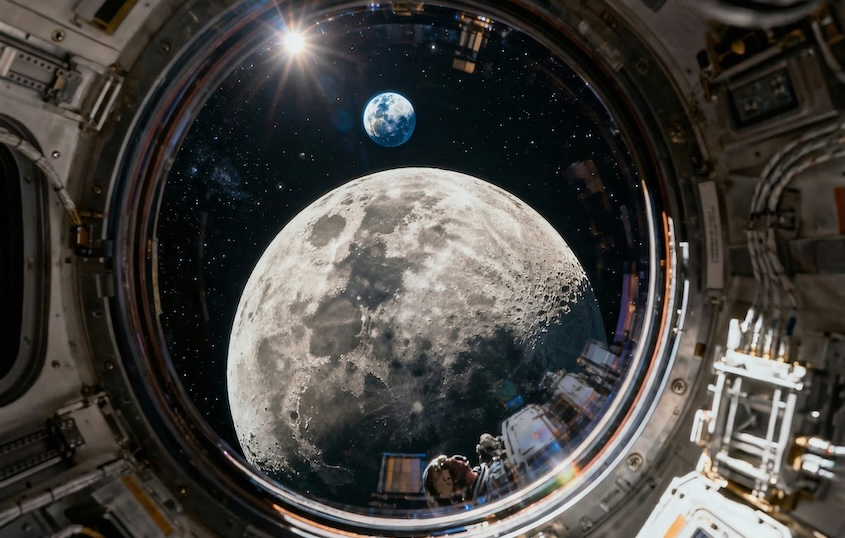 During the flyby, the crew witnessed a solar eclipse from a vantage point few humans have ever experienced. As the Moon moved in front of the Sun, the corona became visible, a faint outer atmosphere usually hidden by brightness.
